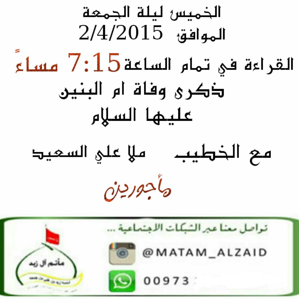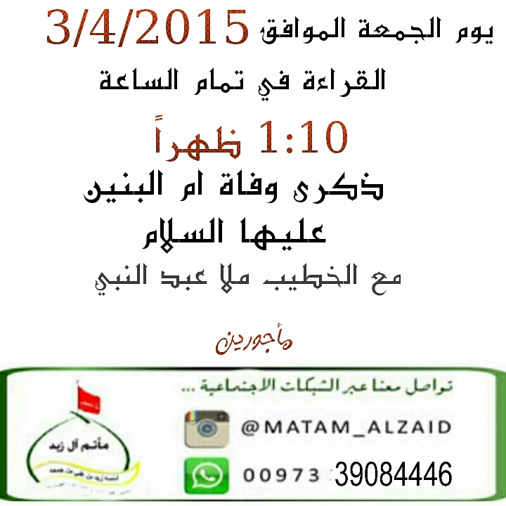 اعلان: مأتم ال زيد (ذكرى وفاة أم البنين)