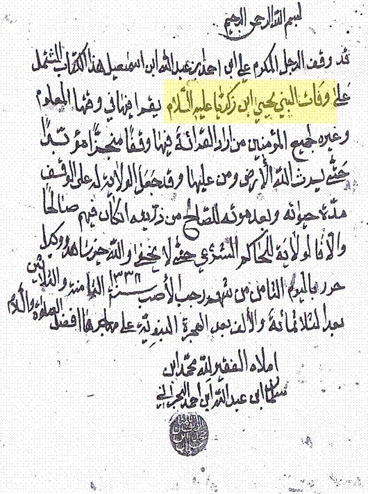 صيغة الوقف الشرعي للمخطوطة (كتاب وفاة النبي يحي) للشيخ علي البربوري لقراءتها في مأتم آل إسماعيل بقرية النويدرات وتاريخها، ويحتمل أن يكون تاريخ نسخ المخطوطة سنة ١٣٣٨ هجرية كتاريخ صيغة الوقف الشرعي، وقد يكون متقدماً عليه، والله أعلم