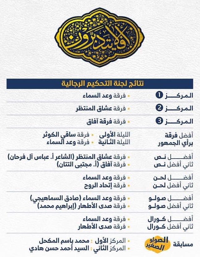 وقد شارك في المهرجان تسعة فرق إنشادية، تقسمت على ليلتين، كان من ضمنها فرقة صدى الأطهار من قرية النويدرات، حيث حققت جائزة ثاني أفضل كورال، وجائزة ثاني أفضل صولو بعد الأداء المتميز للمنشد إبراهيم محمد إبراهيم.
