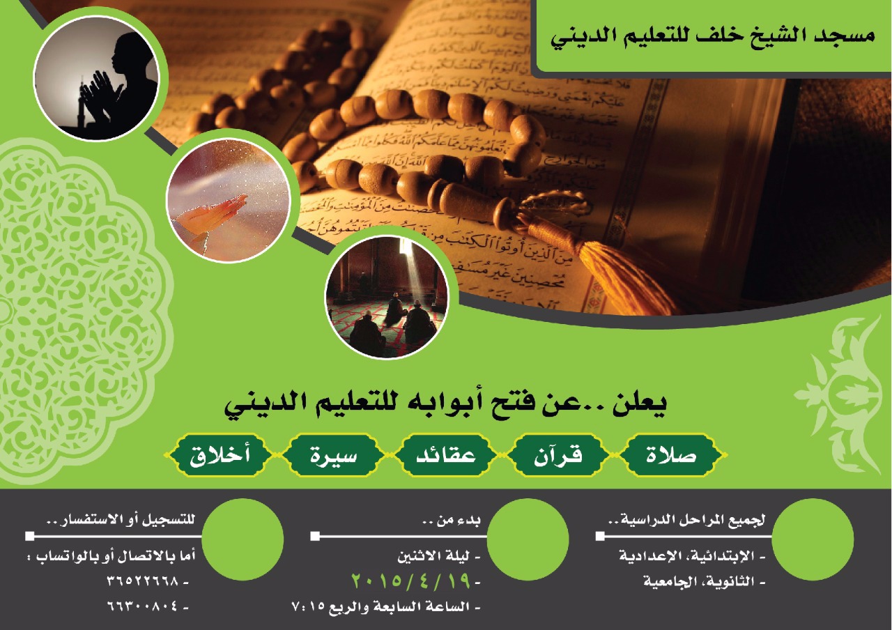 سجد الشيخ خلف للتعليم الديني يعلن عن فتح أبوابه للتعليم الديني (صلاة، قرآن، عقائد، سيرة، أخلاق) لجميع المراحل السنية بدءاً من المرحلة الابتدائية، ولغاية المرحلة الثانوية والجامعة