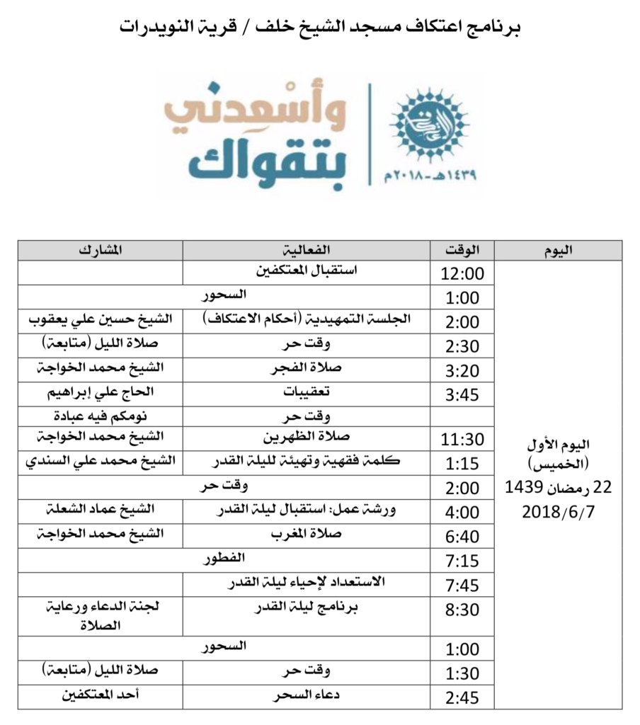 تحت شعار “وأسعدني بتقواك” نُظّم موسم الاعتكاف السنوي الذي يعم أرجاء البحرين، بمشاركة قرية النويدرات للمرة الأولى، وذلك في ٧ – ٩ يونيو ٢٠١٨م الموافق ٢٢ – ٢٤ رمضان ١٤٣٩هـ، بمسجد الشيخ خلف.