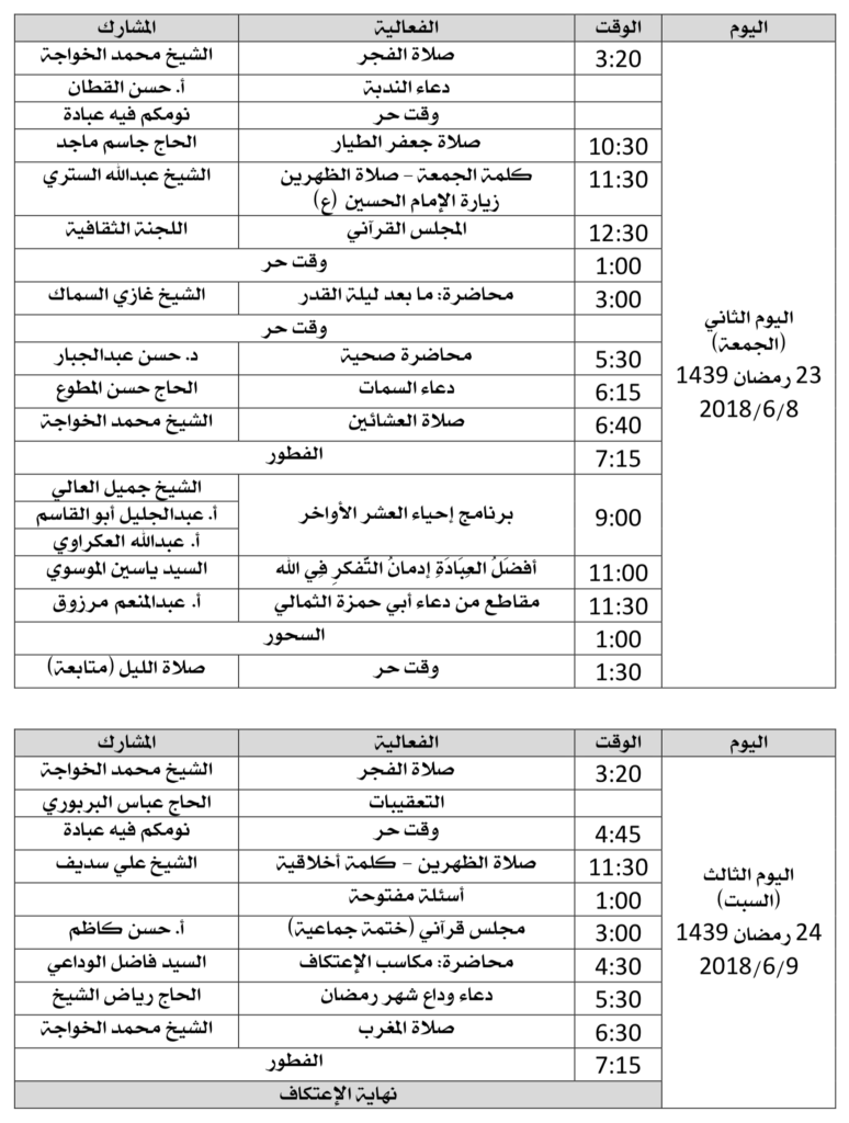 البرنامج الإيماني كان زاخراً بالفعاليات المتنوعة ما بين صلاةٍ ودعاء، كلماتٍ وجلسات، نصائحٍ ومحاضرات، وغيرها من الفقرات التي تبعثُ على السكينة والطمأنينة، وفيما يلي برنامج الاعتكاف الكامل: