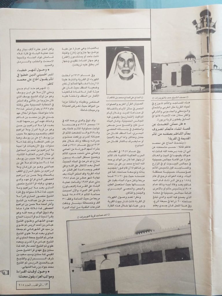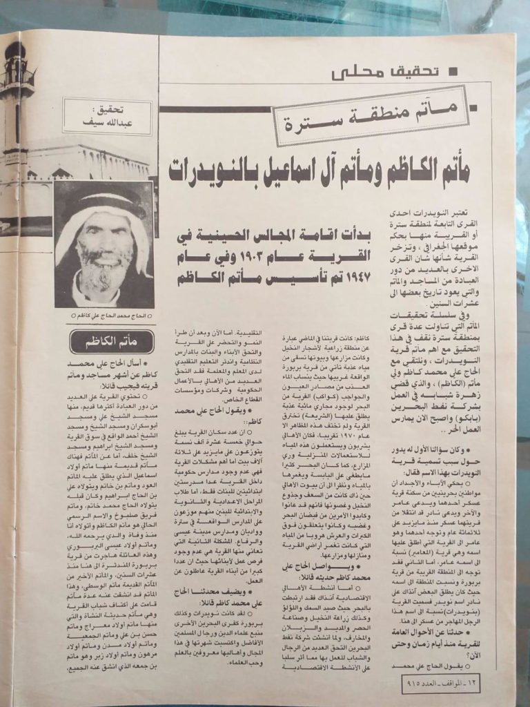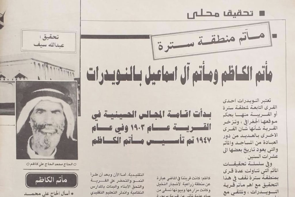 وفي سلسلة تحقيقات المآتم التي تناولت عدة قرى بمنطقة سترة نقف في هذا التحقيق مع أهم مآتم قرية النويدرات، ونلتقى مع الحاج علي محمد كاظم ولي مأتم (الكاظم)، والذي قضى زهرة شبابه في العمل بشركة نفط البحرين (بابكو) وأصبح الآن يمارس العمل الحر.
