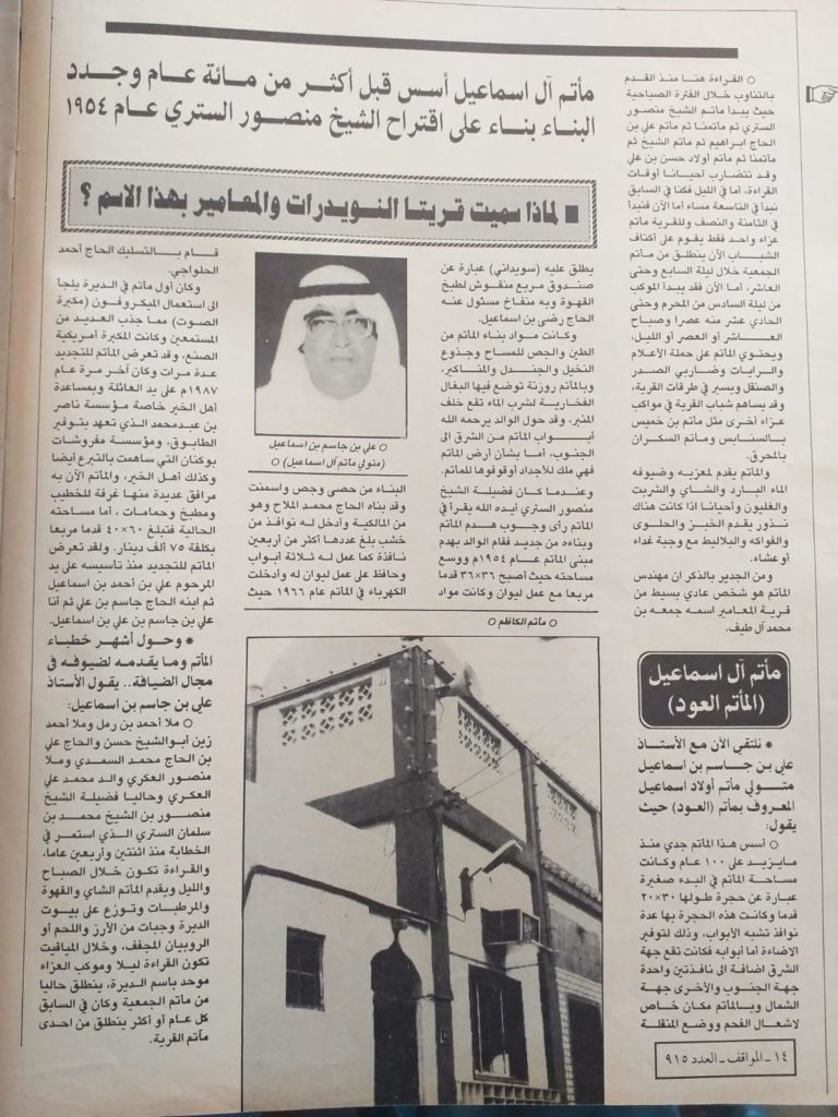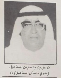 نلتقي الآن مع الأستاذ علي بن جاسم بن اسماعيل متولي مأتم أولاد إسماعيل المعروف بمأتم (العود) حيث يقول: أسس هذا المأتم جدي منذ مايزيد على ١٠٠ عام وكانت مساحة المأتم في البدء صغيرة عبارة عن حجرة طولها ٣٠×٢٠ قدمًا وكانت هذه الحجرة بها عدة نوافذ تشبه الأبواب، وذلك لتوفير الاضاءة أما أبوابه فكانت تقع جهة الشرق اضافة إلى نافذتين واحدة جهة الجنوب والأخرى جهة الشمال وبالمأتم مكان خاص لإشعال الفحم ووضع المنقلة يطلق عليه (سويداني) عبارة عن صندوق مربع منقوش لطبخ القهوة وبه منفاخ مسئول عنه الحاج رضى بن إسماعيل.