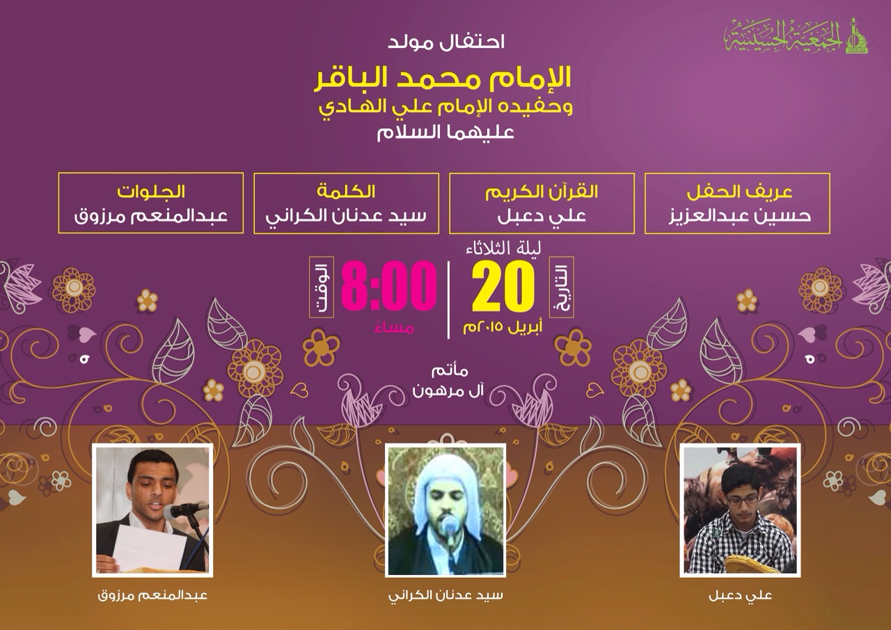 اعلان الجمعية الحسينية لاحتفال مولد الباقر والهادي