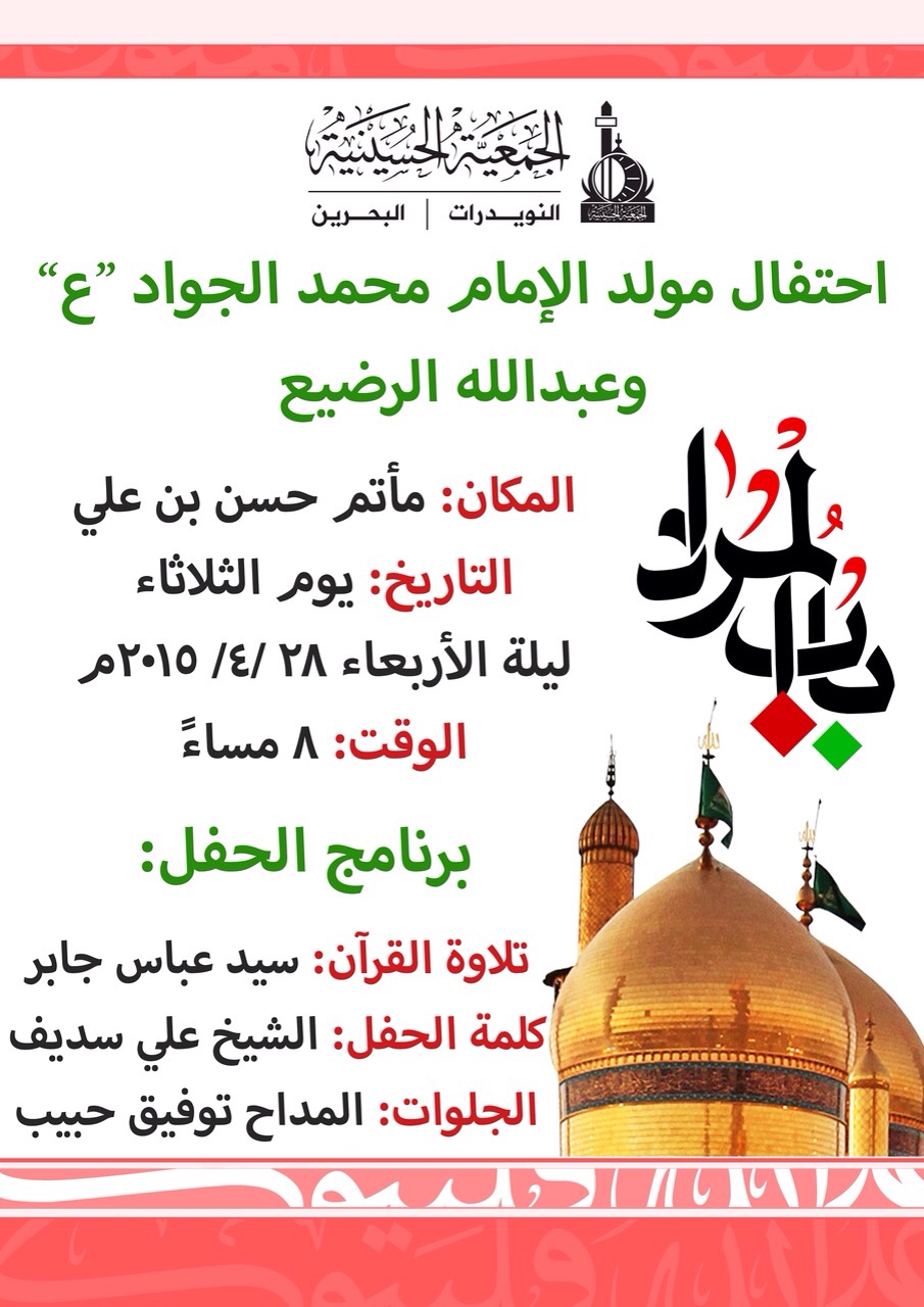 اعلان: احتفال الجمعية الحسينية مولد الإمام محمد الجواد (ع) وعبد الله الرضيع