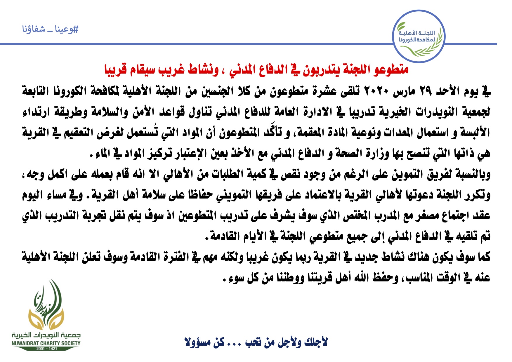 في يوم الأحد ٢٩ مارس ٢٠٢٠ تلقى عشرة متطوعون من كلا الجنسين من اللجنة الأهلية لمكافحة الكورونا التابعة لجمعية النويدرات الخيرية تدريبا في الادارة العامة للدفاع المدني تناول قواعد الأمن والسلامة وطريقة ارتداء الألبسة و استعمال المعدات ونوعية المادة المعقمة، و تأكَّد المتطوعون أن المواد التي تُستعمل لغرض التعقيم في القرية هي ذاتها التي تنصح بها وزارة الصحة و الدفاع المدني مع الأخذ بعين الإعتبار تركيز المواد في الماء.