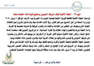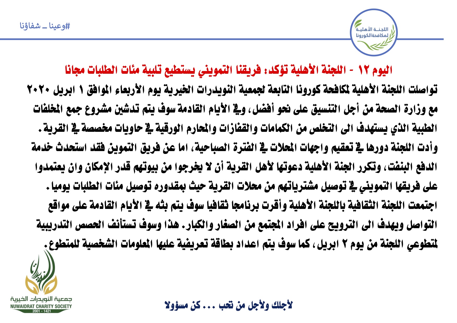 اجتمعت اللجنة الثقافية باللجنة الأهلية وأقرت برنامجا ثقافيا سوف يتم بثه في الأيام القادمة على مواقع التواصل ويهدف الى الترويح على افراد المجتمع من الصغار والكبار. هذا وسوف تستأنف الحصص التدريبية لمتطوعي اللجنة من يوم ٢ ابريل، كما سوف يتم اعداد بطاقة تعريفية عليها المعلومات الشخصية للمتطوع.