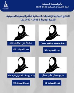 📝 اسفرت الانتخابات النسائية بمأتم الجمعية الحسينية التي أجريت يوم الخميس الموافق 26 أكتوبر ٢٠٢٣ م عن فوز مرشحتين بعضوية الهيئة الإدارية المقبلة ١٤٤٥-١٤٤٧ هجرية.