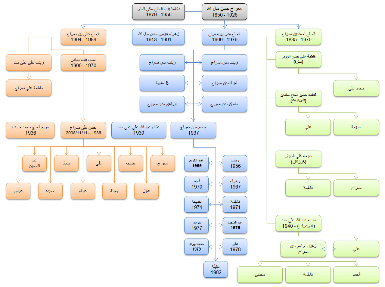 وبتقصي الحقيقة وتعقبها تبين لنا أن الحاج أحمد بن معراج عليه شآبيب رحمة ربه وفيوضاتها قد أملى فعلياً شجرة النسب على ابن أخيه الأستاذ جاسم بن مدن بن معراج قبل (48) عاماً ميلادياً، وكانت عملية الإملاء تتم على فترات غير منتظمة كما أخبرني الأستاذ نفسه في مقابلة شخصية مباشرة عقدت في اليوم الثامن من محرم 1432ه الموافق 14 / ديسمبر 2010م، حيث يتم كتابة شجرة النسب بمقتضى توافر الوقت عند الحاج أحمد وابن أخيه، لهذا السبب استمرت فترة كتابة المادة الثقافية للشجرة حوالي ثلاث سنوات.