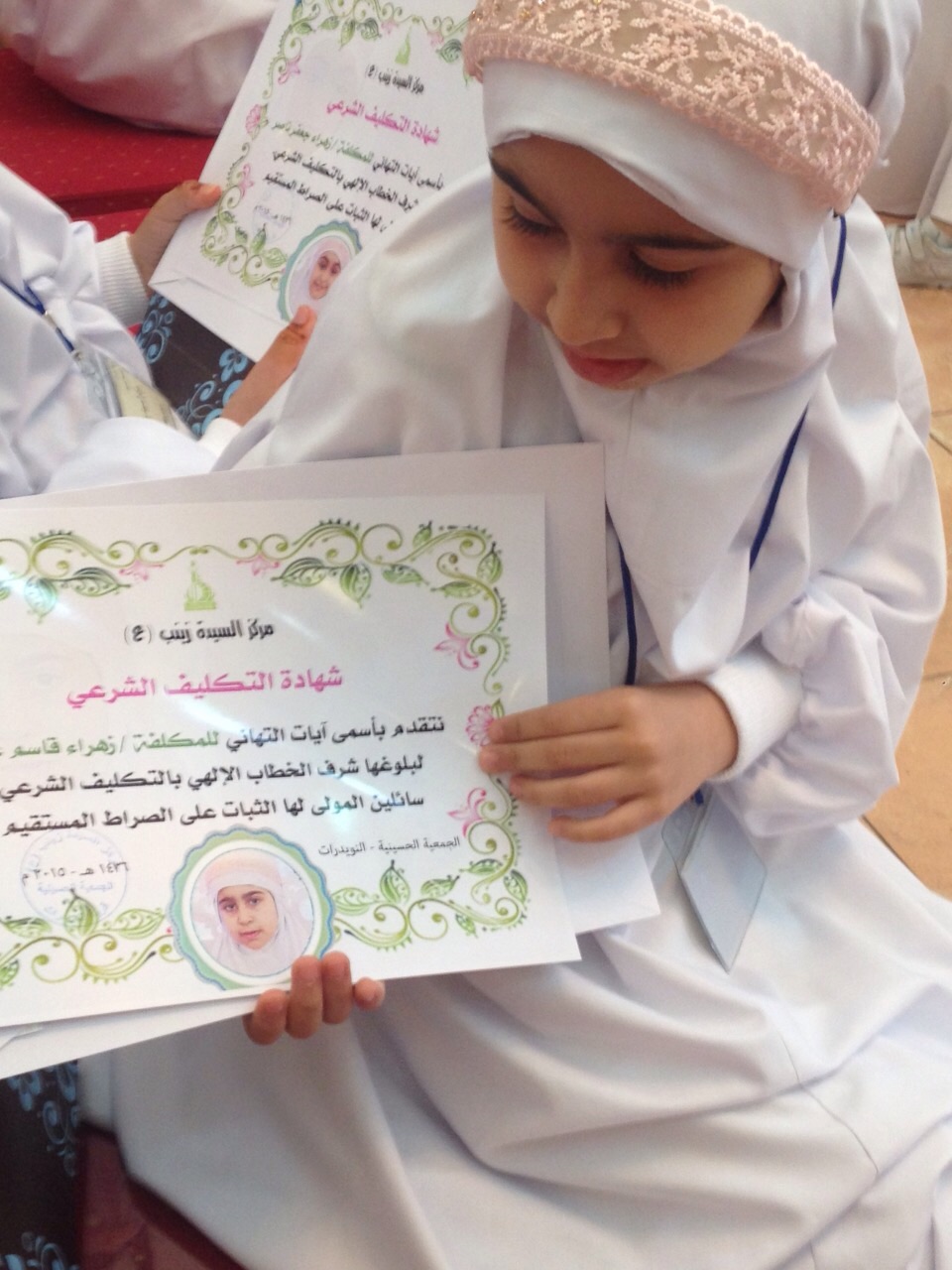 اختتم مركز السيدة زينب عليها السلام لتعليم البنات بالجمعية الحسينية بقرية النويدرات دورة التكليف الحادية عشر (١٤٣٦ هـ – ٢٠١٥م) بتخريج ٦٤ طالبة مكلفة، وبهذه المناسبة نظم المركز يوم أمس الجمعة الموافق ٢٢ مايو ٢٠١٥م حفلا حضرته المكلفات وأمهاتهن والمعلمات.