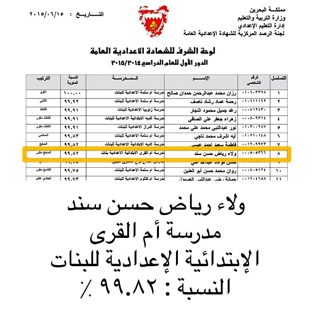لحصولها على المركز السابع مع مرتبة الشرف