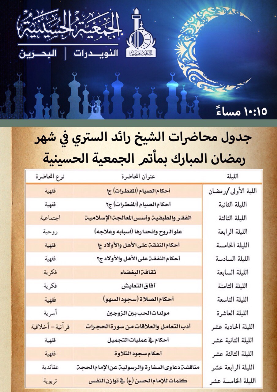 جدول محاضرات الشيخ رائد الستري في شهر رمضان المبارك 17 يونيو 2015 م إعلانات جدول محاضرات الشيخ رائد الستري في شهر رمضان المبارك المكان : مأتم الجمعية الحسينية الوقت : ١٠:١٥ مساءً شارك معنا هذا الموضوع: Share on WhatsApp (فتح في نافذة جديدة) WhatsApp Share on X (فتح في نافذة جديدة) X Share on Telegram (فتح في نافذة جديدة) Telegram Share on Facebook (فتح في نافذة جديدة) فيس بوك Email a link to a friend (فتح في نافذة جديدة) البريد الإلكتروني اطبع (فتح في نافذة جديدة) طباعة