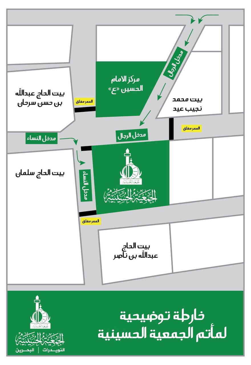 ١. غلق بعض الطرق المؤدية لمبنى الجمعية الحسينية والاقتصار على مدخلين فقط (مرفق خارطة توضيحية):