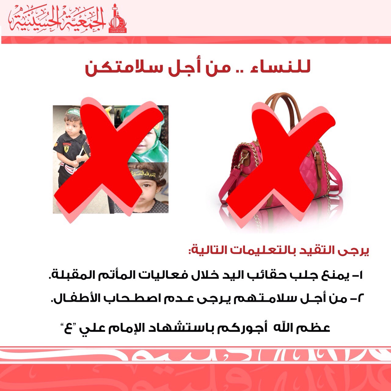 ٤. عدم قيام النساء بجلب أي نوع من الأكياس أو الحقائب اليدوية معهن للمأتم، كما يرجى عدم اصطحاب الاطفال خلال فعالية ليلة القدر – قدر الإمكان.
