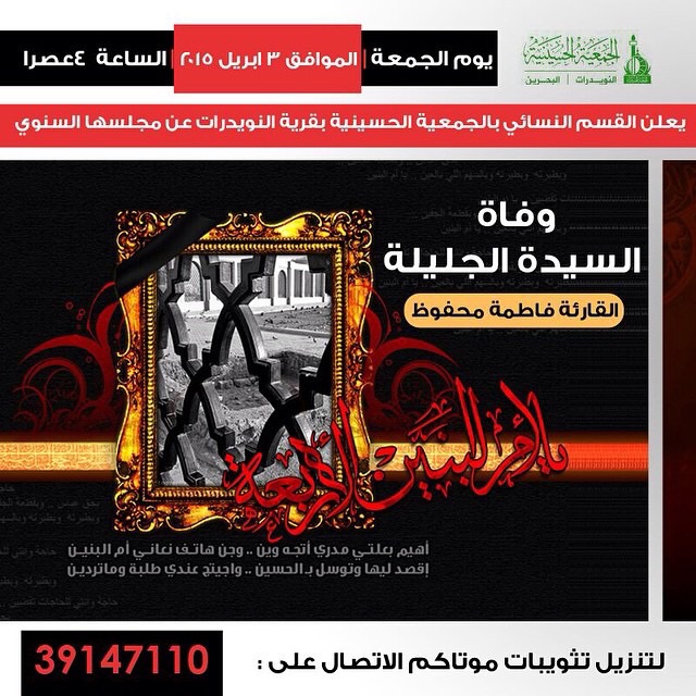 اعلان : القسم النسائي بالجمعية الحسينية – ذكرى وفاة ام البنين