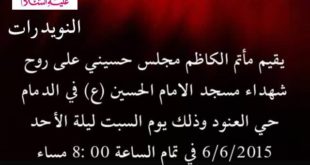 يقيم مأتم الكاظم مجلس حسيني على أرواح شهداء مسجد الامام الحسين عليه السلام بالدمام وذلك يوم السبت ليلة الاحد الموافق 6 / 6 / 2015 م في تمام الساعة 8:00مساء ملا علي الفردان