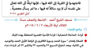برنامج الإحياء في مسجد الشيخ أحمد ليلة الأربعاء الموافق ٢ / ٦ /٢٠١٥م الدعاء قراءة دعاء المناجاة الشعبانية والأدعية القصيرة المتعلقة بهذه الليلة الصلاة الصلاة ركعتان ” سورة الحمد وسورة الكافرون في الركعة الأولى والحمد والتوحيد في الثانية وبعد الفراغ التسبيح ٣٣ والتحميد ٣٣ والتكبير ٣٣ ثم قراءة دعاء يا …