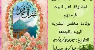 يدعوكم مأتم أم البنين عليها السلام لمشاركة أهل البيت عليهم السلام فرحتهم بولادة مخلص البشرية يوم الجمعة الموافق 5 / 6 / 2015 م الساعة 8:30 مساءاً