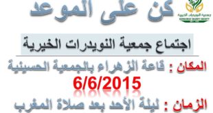 جمعية النويدرات الخيرية تدعوكم لحضور اجتماع لمناقشة مستجدات المشروع الاستثماري قاعة الزهراء بالجمعية الحسينية السبت ليلة الأحد الموافق 6 / 6 / 2015 م بعد صلاة المغرب ( هناك وجبة افطار )