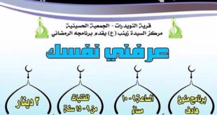 يعلن مركز السيدة زينب لتعليم البنات بالجمعية الحسينية بقرية النويدرات عن برنامجه الرمضاني “عرفني نفسك” برنامج منوع وهادف للفتيات 9 – 15 سنة الحلقة 2 + الاعدادي 9 – 10 مساء قاعة الحوراء ٣ دينار البرنامج ليلة حادي وعرفني شهرك الكريم ليلة ثالث ربيع القلوب ليلة خامس صحتي وشهر الصيام …