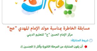 يعلن مركز الإمام الحسين الثقافي عن إقامة مسابقة (( الخاطرة )) عن الإمام المنتظر عج بمناسبة مولده الشريف. والمشاركة تكون من خلال الشروط التالية : أن يكون المشارك من المرحلة الثانوية وأكثر (( للجنسين )) أن تكون الخاطرة باللغة العربية الفصحى. أن تكون الخاطرة عن الإمام المنتظر عج. أن ترسل …