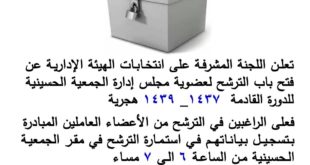 تعلن اللجنة المشرفة على انتخابات الهيئة الإدارية عن فتح باب الترشح لعضوية مجلس إدارة الجمعية الحسينية للدورة القادمة 1437 – 1439 هجرية فعلى الراغبين في الترشح من الأعضاء العاملين المبادرة بتسجيل بياناتهم في استمارة الترشح في مقر الجمعية الحسينية من الساعة 6:00 الى 7:00 مساءًا. يُفتَح باب الترشح من يوم …