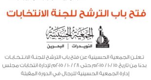 التفوا حول جمعيتكم، فهي لكم وبكم، تبقى خادم أهل البيت [المرحوم الحاج حبيب عبدالله] تعلن الجمعية الحسينية عن فتح باب الترشح للجنة الانتخابات بدءًا من تاريخ ١٥ / ١٠ / ٢٠١٥م حتى ٢٨ / ١٠ / ٢٠١٥م لإدارة انتخاب مجلس إدارة الجمعية الحسينية للرجال في الدورة المقبلة للترشح والاستفسار 39875425 …