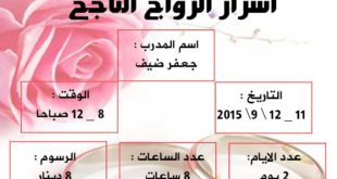 ينظم مركز المرأة الخيري بجمعية النويدرات الخيرية ورشة “أسرار الزواج الناجح” اسم المدرب جعفر ضيف تاريخ ١١ – ١٢ / ٩ / ٢٠١٥ م الوقت ٨ – ١٢ صباحا عدد الأيام ٢ عدد الساعات ٨ ساعات الرسوم ٨ دينار للتسجيل ٣٥٠٤٠٦٢٩