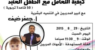 ينظم مركز المرأة الخيري بجمعية النويدرات الخيرية ورشة ” كيفية التعامل مع الطفل العنية” ( ٥٠ قاعدة تربوية) الأستاذ جعفر ضيف التاريخ ٢٩ / ٨ / ٢٠١٥ يوم السبت ٩:٠٠ – ١١:٣٠ صباحاً الرسوم مجانا