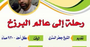 رحلة إلى عالم البرزخ تقديم الشيخ جعفر الستري الوقت كل يوم أحد من ٦ / ٩ إلى ٤ / ١٠ / ٢٠١٥م الساعة ٧:٣٠ مساءًا الرسوم ٢ دينار