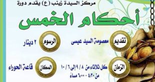 أحكام الخمس تقديم معصومة السيد عيسى كل ثلاثاء من ٨ / ٩ إلى ٦ / ١٠ من ٤:٣٠ – ٦:٠٠ مساءًا قاعة الحوراء الرسوم ٢ دينار
