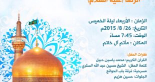 يحيي مأتم الكاظم مولد الامام علي بن موسى الرضا عليه السلام وذلك يوم الخميس ليلة الجمة 27/8/2015 م في تمام الساعة 7:30 مساءًا